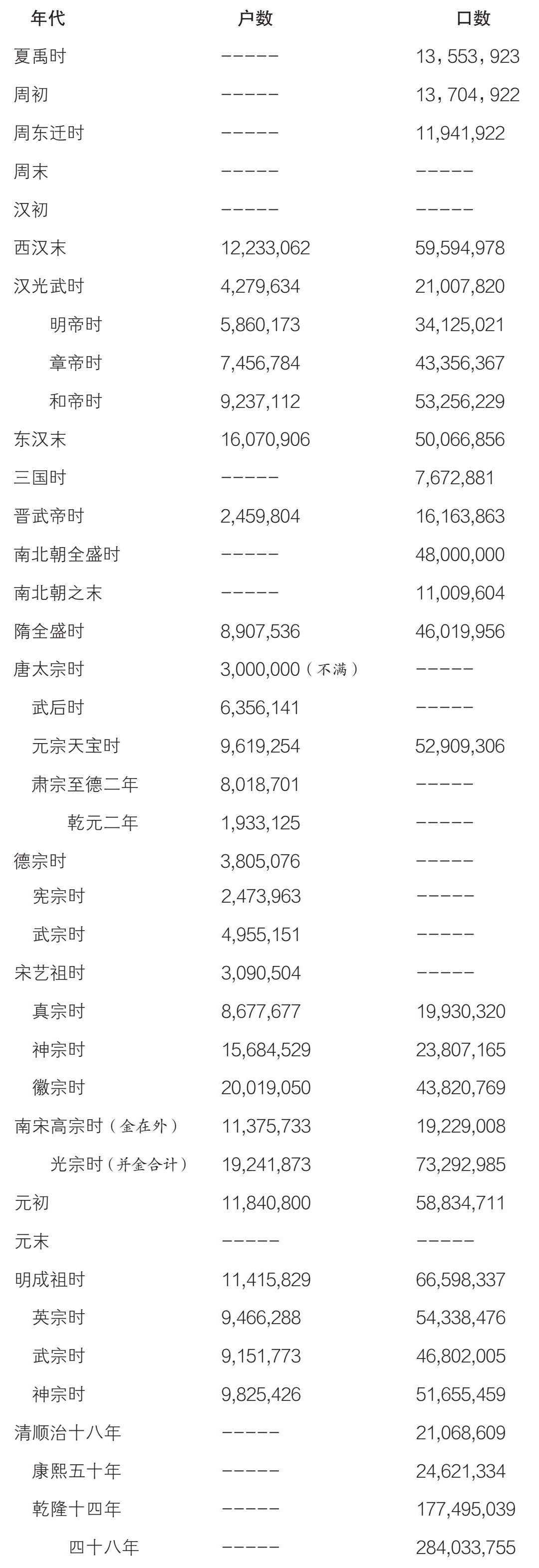 由前表观之,则中国自清乾隆以前,民数未有逾百兆者。其最盛为南宋,宋金合七十三兆余;次则明成祖时,六十六兆余;又次则西汉孝平时,五十九兆余;最少者为三国,乃仅为七兆余。呜呼,孰谓吾先民而仅有此?今姑据此不实不尽之统计一研究之。