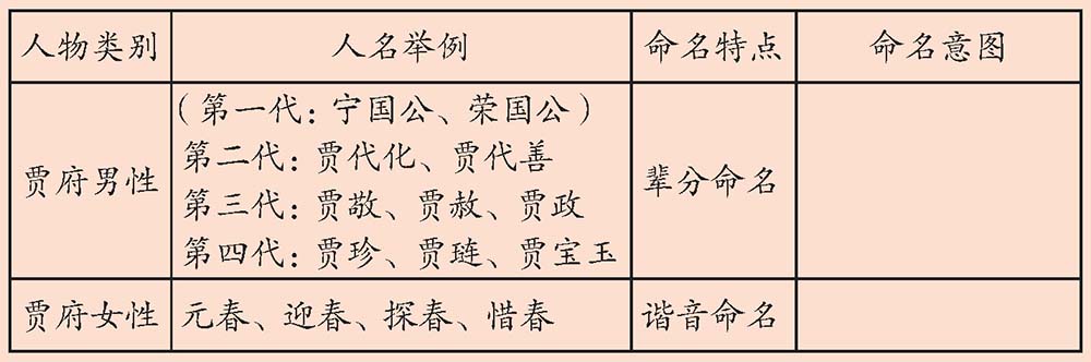 贾府的人物关系错综复杂,人物命名也独具匠心。阅读第二回“冷子兴演说荣国府”,填写下列表格,探究命名意图。