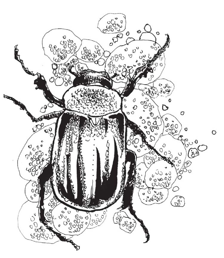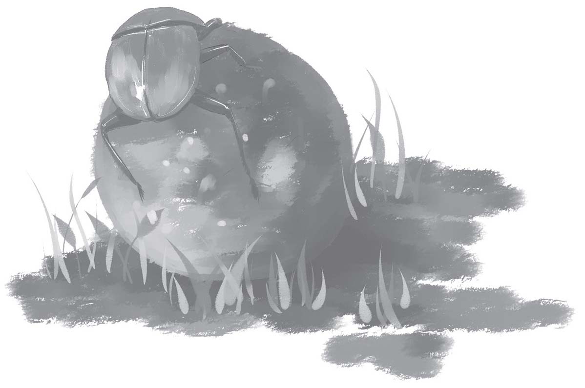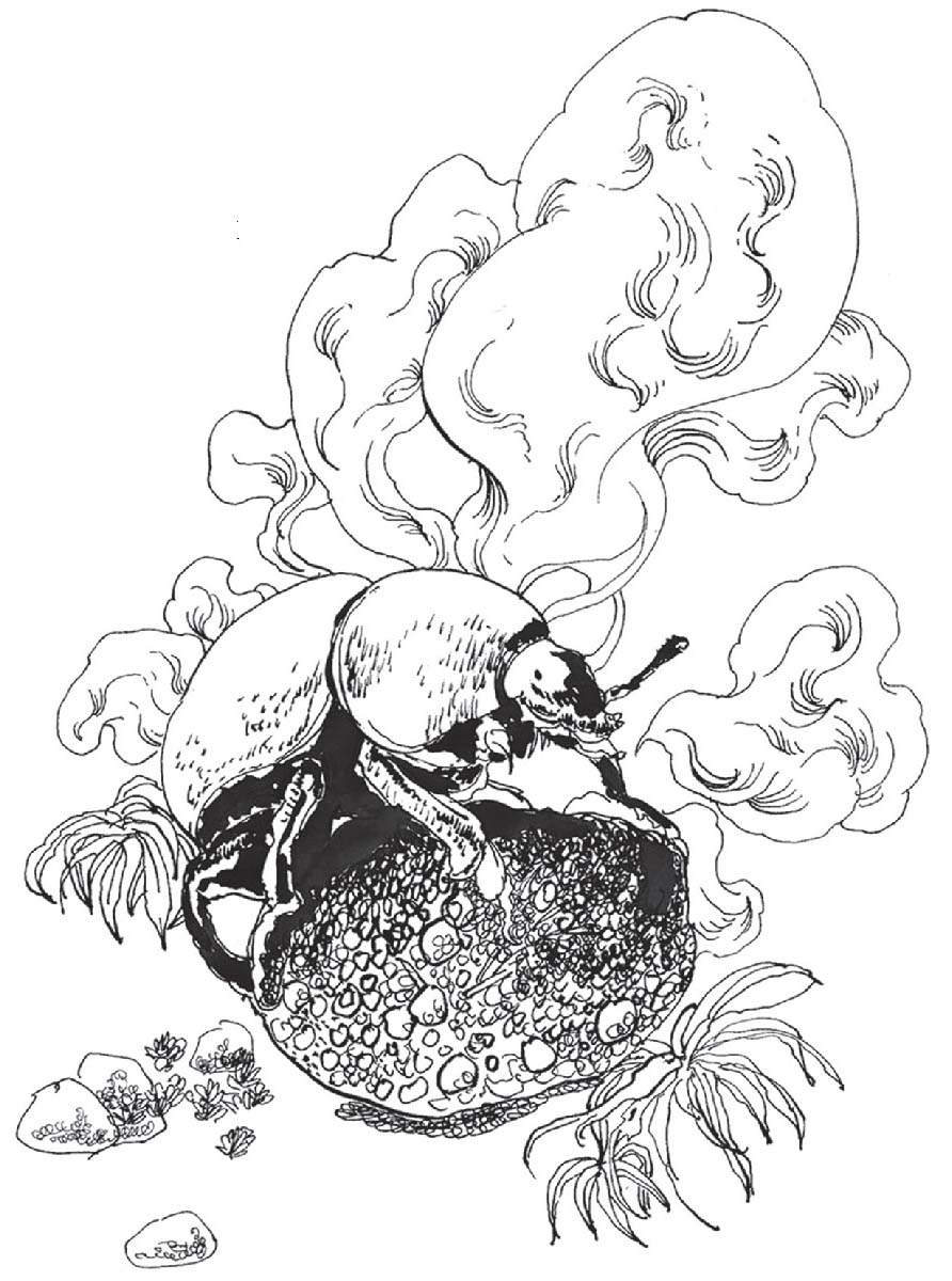 那个生怕到得太晚而向着粪堆一溜儿小跑的是哪一位?它那长长的爪子僵硬笨拙地捯着,仿佛其肚腹下面有一个机械在推动着似的;它的那对棕红色小触角大张开来,透着垂涎欲滴的焦急不安。它在拼命地赶,它赶到了,还撞倒了几位食客。它就是圣甲虫,一身墨黑,是食粪虫中个头儿最大又最有名气的一种。古埃及对它尊崇备至,把它视作长生不老的象征。它已入席,与其同桌的食友并肩战斗,其食友们正在用自己宽大的前爪心轻轻地拍打粪球,进行最后的加工,或者再往粪球上加上最后一层,然后抽身而去,回家安安心心地享用自己的劳动成果。我们来看一看那有名的粪球的一道道制作工序。
