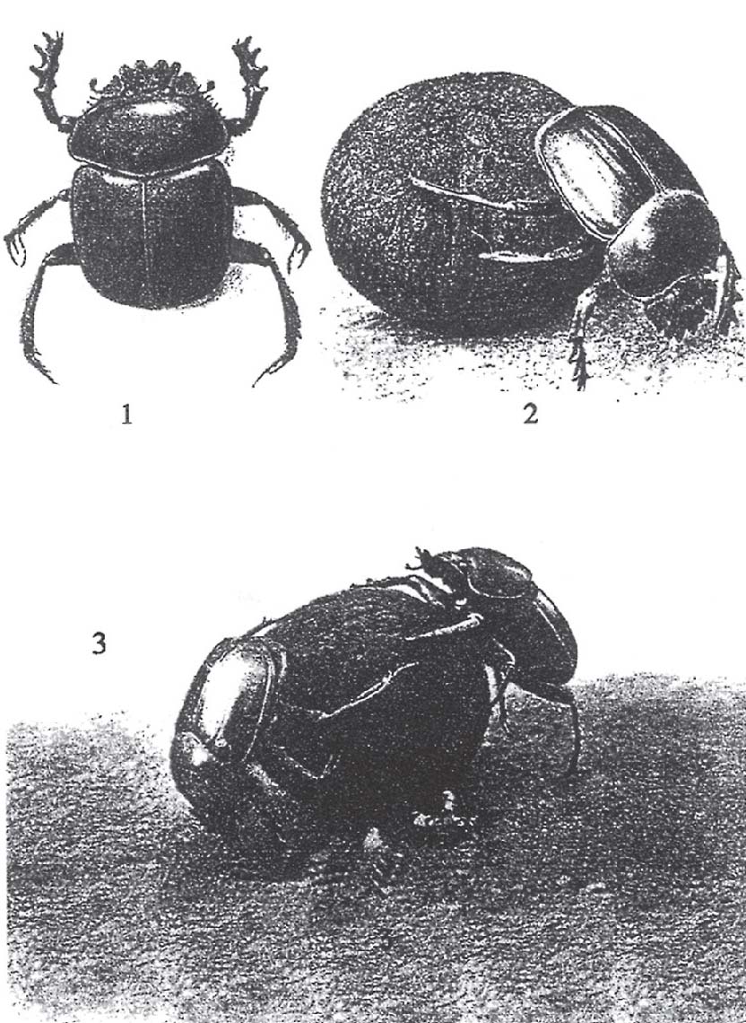 1.圣甲虫 2.独自滚动粪球的圣甲虫 3.两只圣甲虫合作滚动粪球