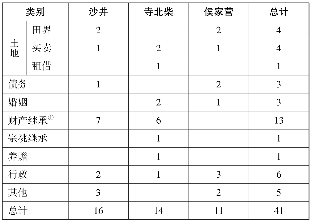这一广为人们接受的假设与我所掌握的关于清代和民国时期的县法庭记录相矛盾,它也和满铁的村庄调查资料相矛盾。满铁调查者记录了沙井、寺北柴和侯家营这三个村庄从20世纪20年代到20世纪40年代的41起纠纷,其中有18起最后演变成法庭诉讼案。表1和表2分类列出了这些纠纷和诉讼案件。