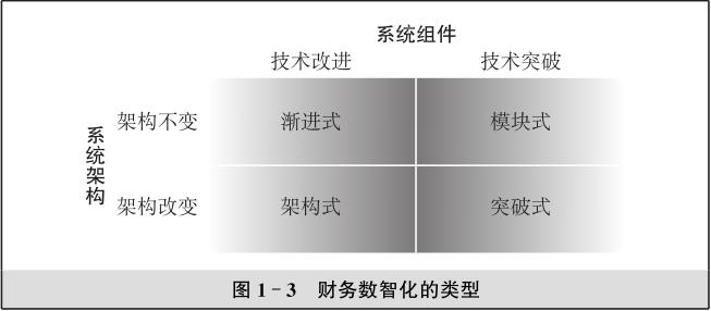 在图1-3中,水平维度描述了系统组件,而垂直维度强调系统架构。左上角是渐进式,在数字化转型中只需要进行技术改进,系统架构不变。大部分的数字原生企业属于这种情况,比如阿里巴巴,其业务数字化做得很好,需要改进技术将业务信息引入财务的海洋中,财务数智化水到渠成。模块式需要技术突破,但架构不变。美的采用的是这种模式。左下角是架构式,这需要架构改变和技术改进。右下角是突破式,这种路径更具创造性和重塑性,不仅需要技术突破,更需要系统架构的改变。受限于企业技术上的惰性、利益冲突和内部文化,突破式在实际中很难实施,企业要“创造”河流并使其汇入大海是非常困难的。但是困难并不代表无法实现,突破式可能的实现方案是从模块式或架构式进行转变。从动态能力的视角看,技术诀窍(比如缄默知识)是需要通过学习得到积累的。