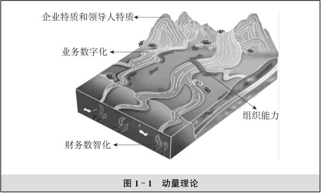 如图1-1所示,动量理论涉及四个要素:河流、高山、水闸和大海。河流的流向代表着数字化转型是大势所趋,企业要顺势而为。高山代指企业特质和领导人特质,决定了企业的数字化转型,塑造了转型的势头。它是一个公司或一个管理团队分配资源的动力所在。水闸代表了组织能力,我们可以通过水闸来控制流量和水位。企业可能有动力投资于数字项目,但如果没有组织能力,它们就无法成功地实现数字化。河流代表业务数字化,公司内部的数字化通常从业务开始,因为业务数字化支持公司的运作,业务数字化过程中会产生信息流、资金流、物流。正如我们所知,河流最终流入大海。财务的数智化就像河流流入大海一样,企业所有业务的信息流、资金流、物流汇聚万涓细流而波澜壮阔,都会汇总到财务部门。