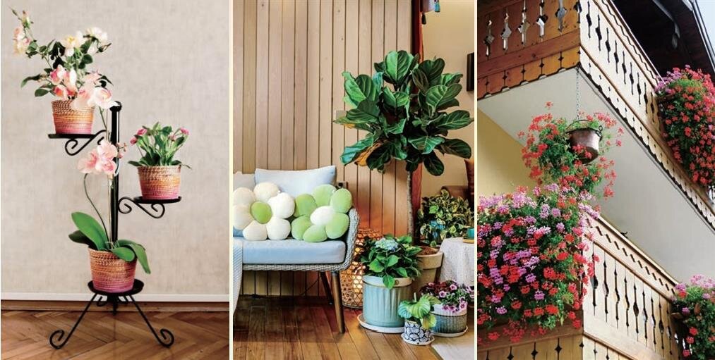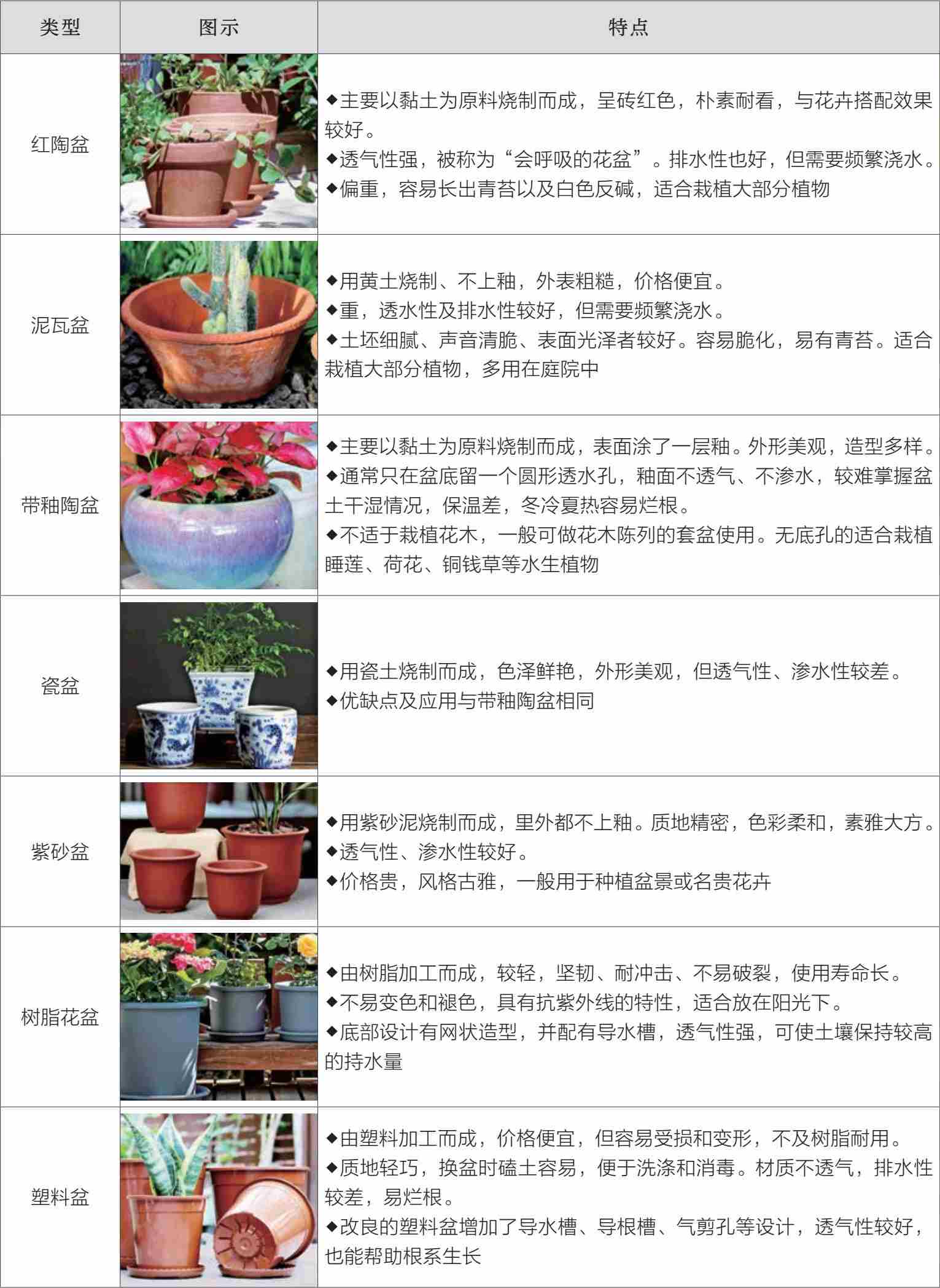 作为阳台最常用的容器,花盆应考虑材质、风格和整体搭配效果综合选择。一般来说,小苗用小盆,大苗用大盆。对于小植株来说,花盆太大容易积水,造成根系缺氧、烂根。植株外形较高时选用较大的花盆,较矮时选用较小的花盆,视觉效果会更好。悬垂式花木(如吊兰、常春藤等)可选用高筒型花盆,下垂的枝蔓与盆体相衬,饶有一番情趣。丛生状花木(如杜鹃、海棠、石榴、瓜叶菊等)枝叶伸展面积较大,适合使用大口花盆。