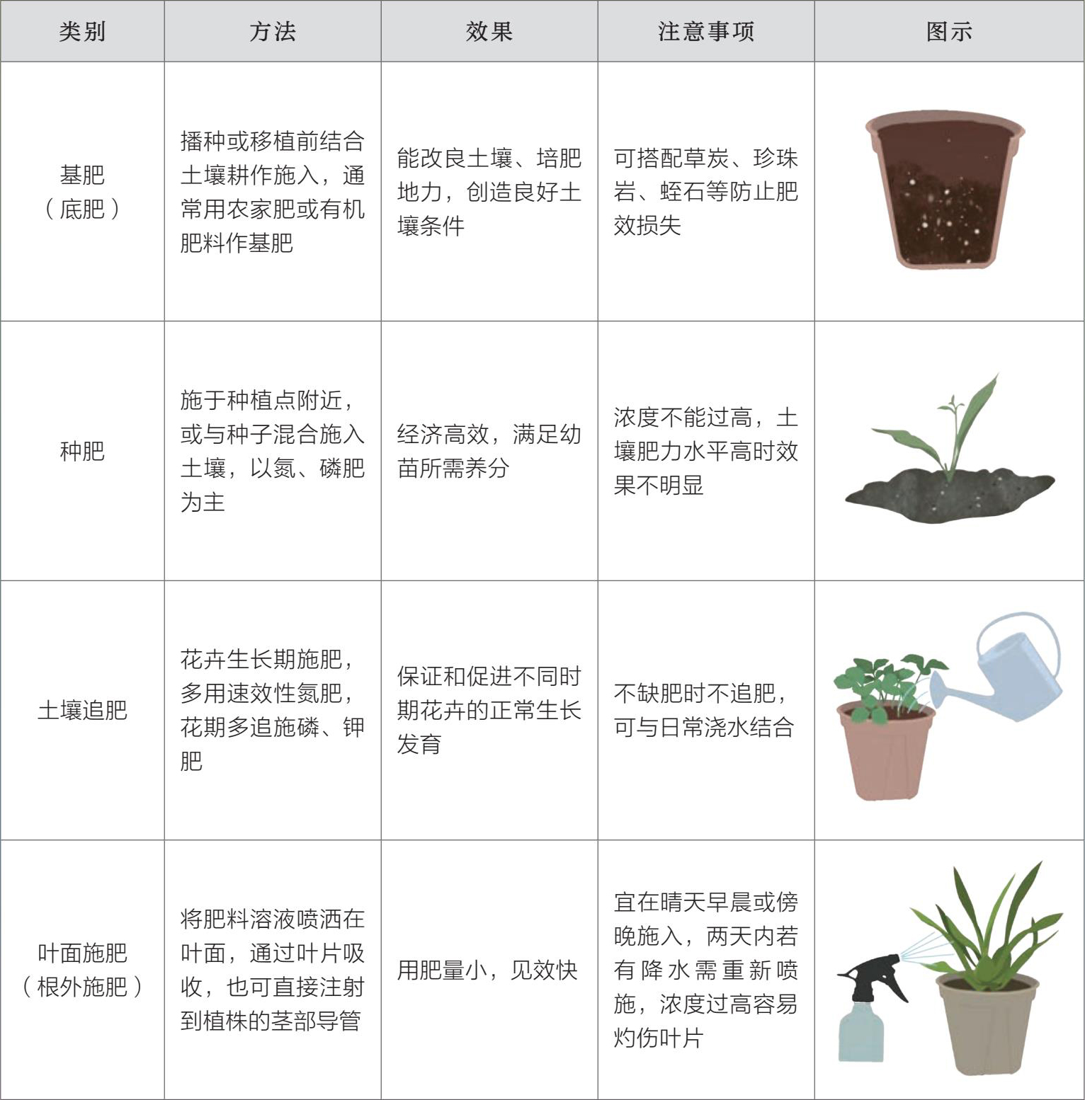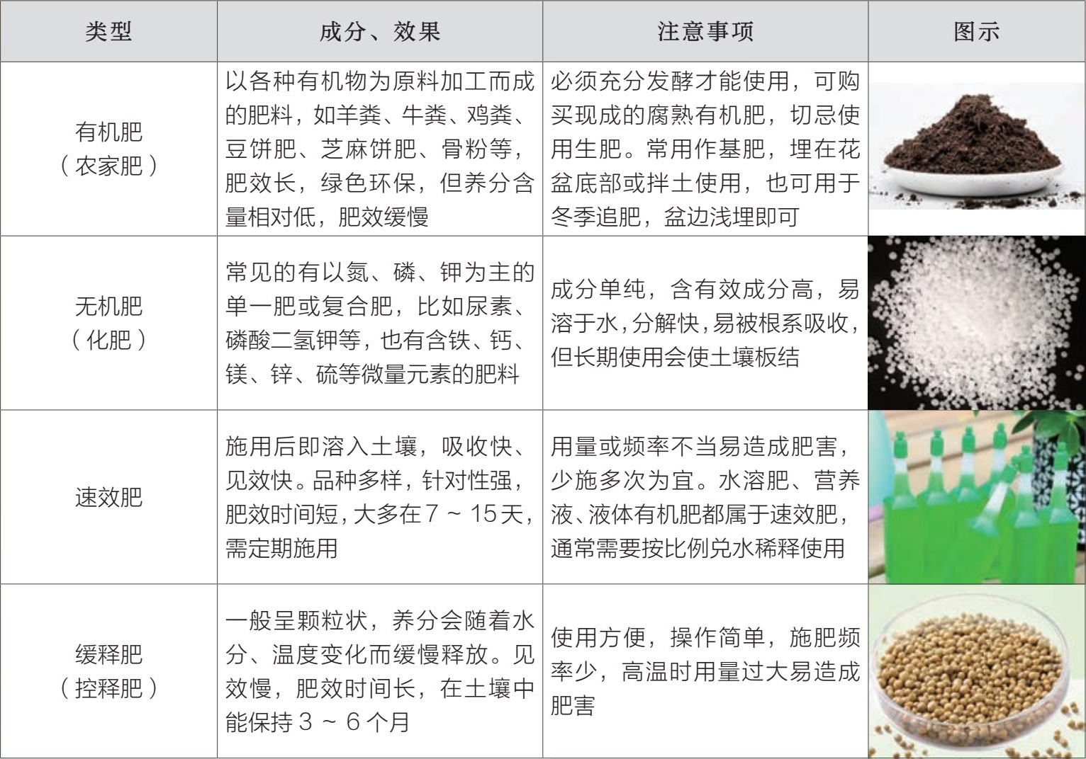 市面上售卖的各种绿植肥料,主要是由氮、磷、钾三大营养元素按比例配制而成的,分单一型和复合型。施肥时,应尽量减少使用单一元素肥,植物生长需要多种元素共同作用。如通用型肥料氮、磷、钾比例均衡,在开花期、成长期、花后期使用;促花型肥料磷、钾含量高,如磷酸二氢钾,在花芽分化及开花前后使用。此外,常用的还有硫酸亚铁,用于调节土壤酸度,适合喜酸类植物,如月季、蓝雪花、绣球、兰花、栀子、茉莉等;螯合铁用于预防缺铁黄化,增强光合作用。