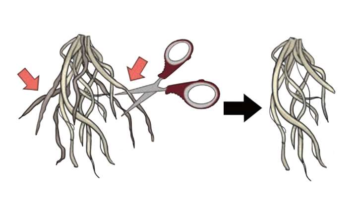 一般出现问题的根系颜色与健康根系的颜色不同,用手捏住会干瘪发软,这样就需把腐烂的根系剪掉,必要时还要用多菌灵浸泡杀菌,以免进一步感染。修剪后的根系应是分布均匀而整齐的。