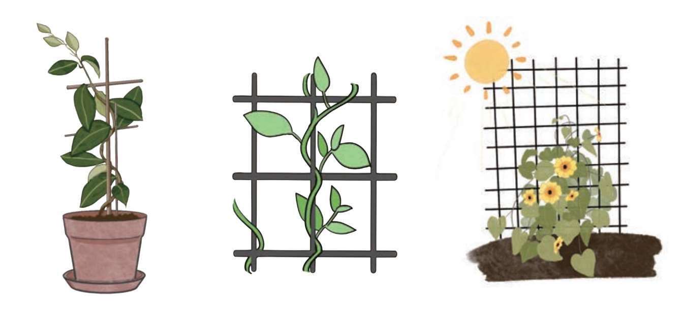 攀援植物和蔓生植物需要花费更多时间打理,要及时将新抽枝条系到附着物上,并剪除影响外观的细长枝条。根据整体造型决定缠绕方式,可让攀援植物缠绕在支架或遮光网上。西晒的阳台还可以引导藤本植物形成幕帘,遮住夏日烈阳,降低阳台及室内温度。