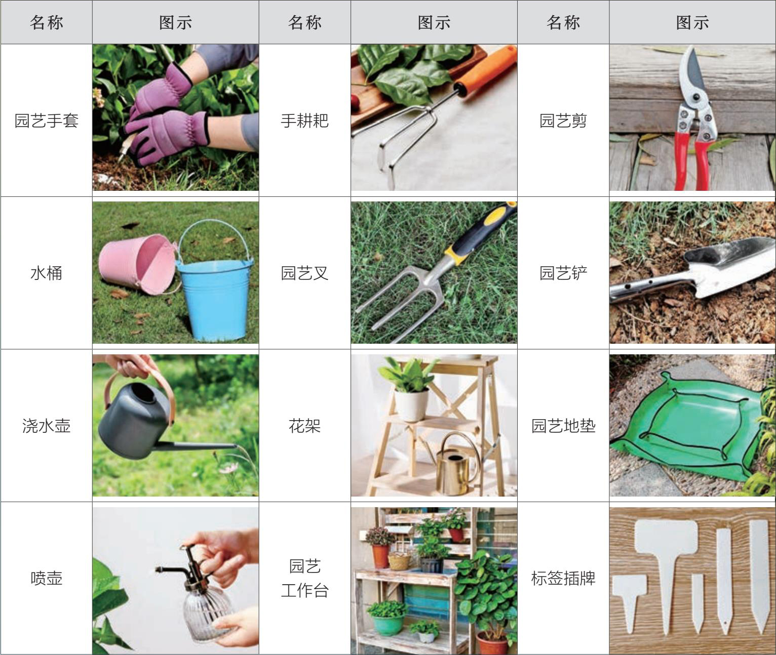 适用于阳台的园艺工具数量及种类非常多,除下表所述工具外,还可以根据面积大小、种植类型、维护强度等因素,补充购买其他工具,如刻度量杯、小刷子等。