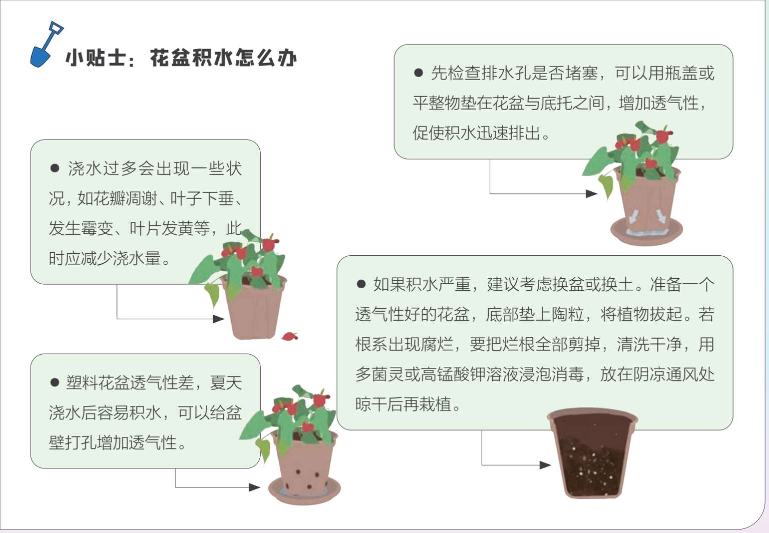 浇完水应及时清理花盆托盘,避免形成积水影响盆土透气,也避免积水成为蚊虫滋生的温床。若盆栽太大不易移动,可用大号的注射器把托盘里的水抽出来,或者把托盘换成可以接水的底托。