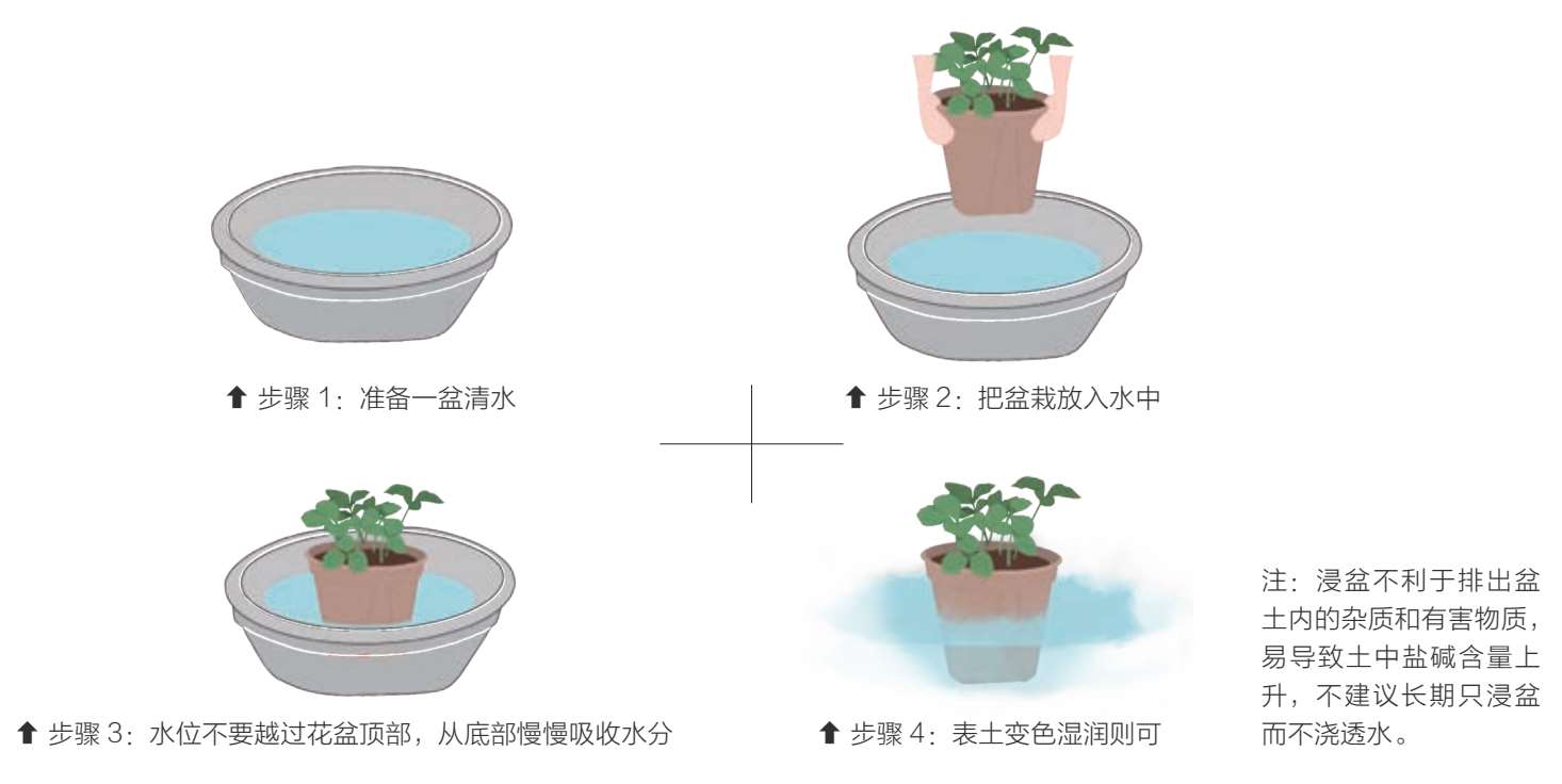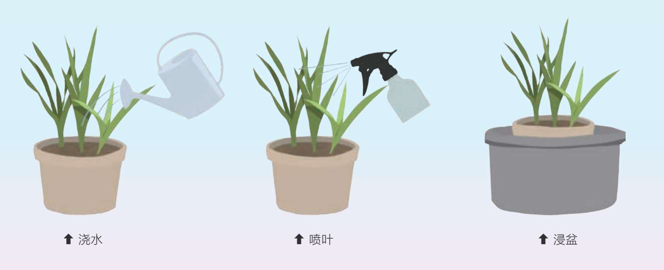 观察表土颜色,如颜色变浅,叶片开始柔软下垂,就需要给花卉浇水了。大部分植物若土壤表面干了,或者表土以下1~2cm是干的,及时浇水就可以了。