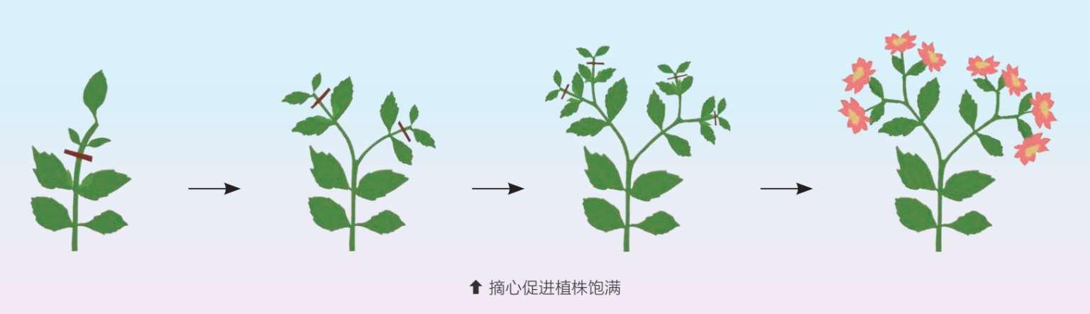 摘心又称打顶,是在花卉生长期用手或剪刀除去嫩梢的生长点,促进多生侧枝,多形成花芽,使植株矮化、丰满、多开花。