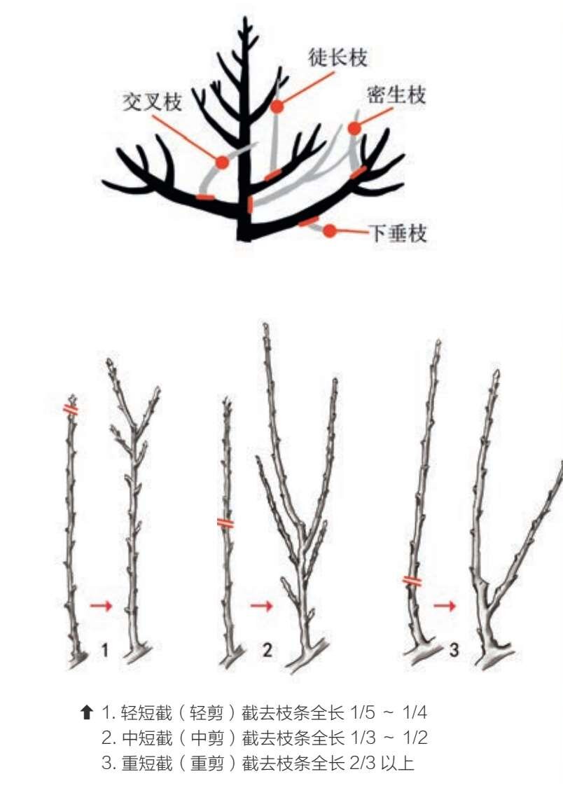 修枝包括疏枝和短截。为了调整树姿,利于通风透光,提高叶片光合效能,常将枯枝、病虫枝、纤细枝、平行枝、徒长枝、密生枝等剪掉,防治病虫害。