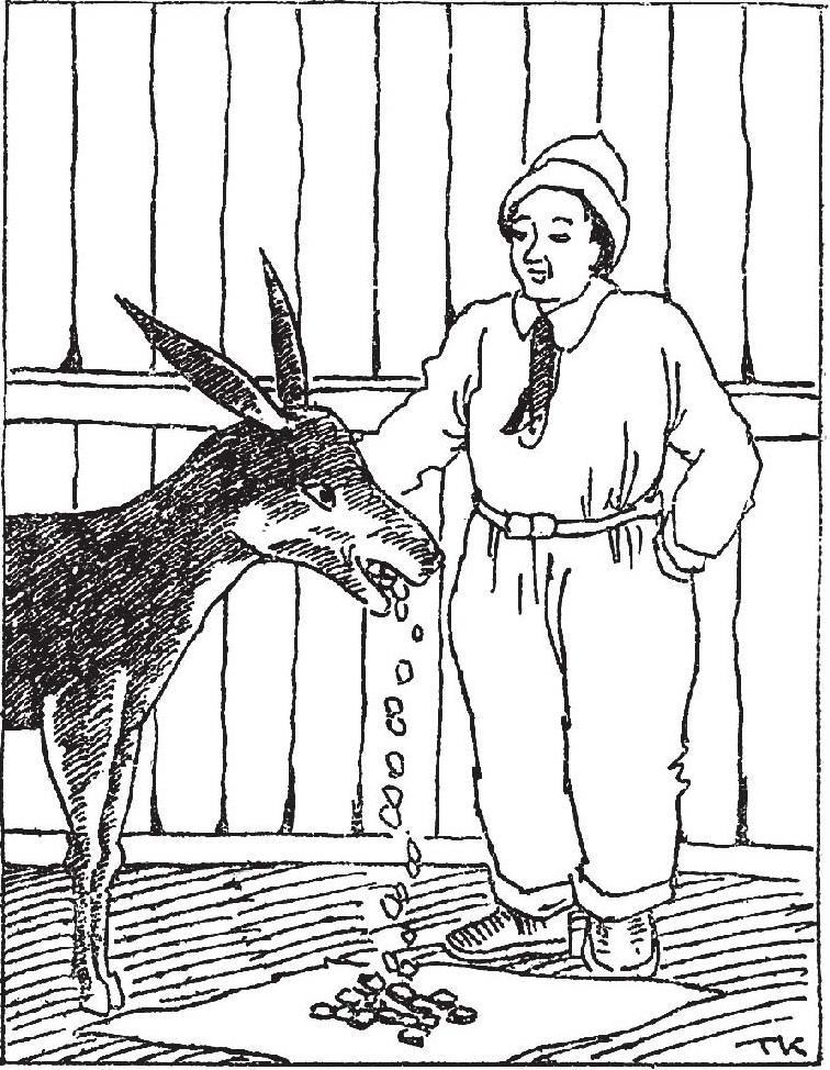 店主莫名其妙,心里很好奇,就偷偷跟上他。客人闩上了厩门,店主就凑着门上的树节疤眼儿往里瞅。只见陌生人把桌布铺在毛驴脚下,口里念道:“布利克勒布利!”那畜生便前吐后屙,雨点一般地落在桌布上的都是亮闪闪的金子。