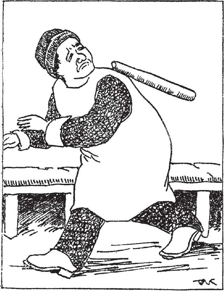 “这我愿意告诉你,”师父说,“要是有谁伤害你,你只说‘棒槌,出来!’棒槌立刻就蹦出口袋,到那人的背上去跳舞,跳得那么带劲儿,叫他八天八夜也不能再动弹。你不说‘棒槌,进去!’它绝不停止。”