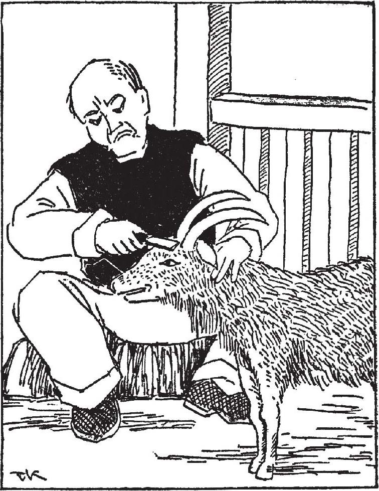 他三脚两步奔回去取来了刮胡刀,给羊脑袋抹上肥皂,把它剃得跟手掌心似的精光。他认为用尺子对于羊太客气了,就拿来一条鞭子,给羊狠狠几鞭,抽得它没命地逃跑了。