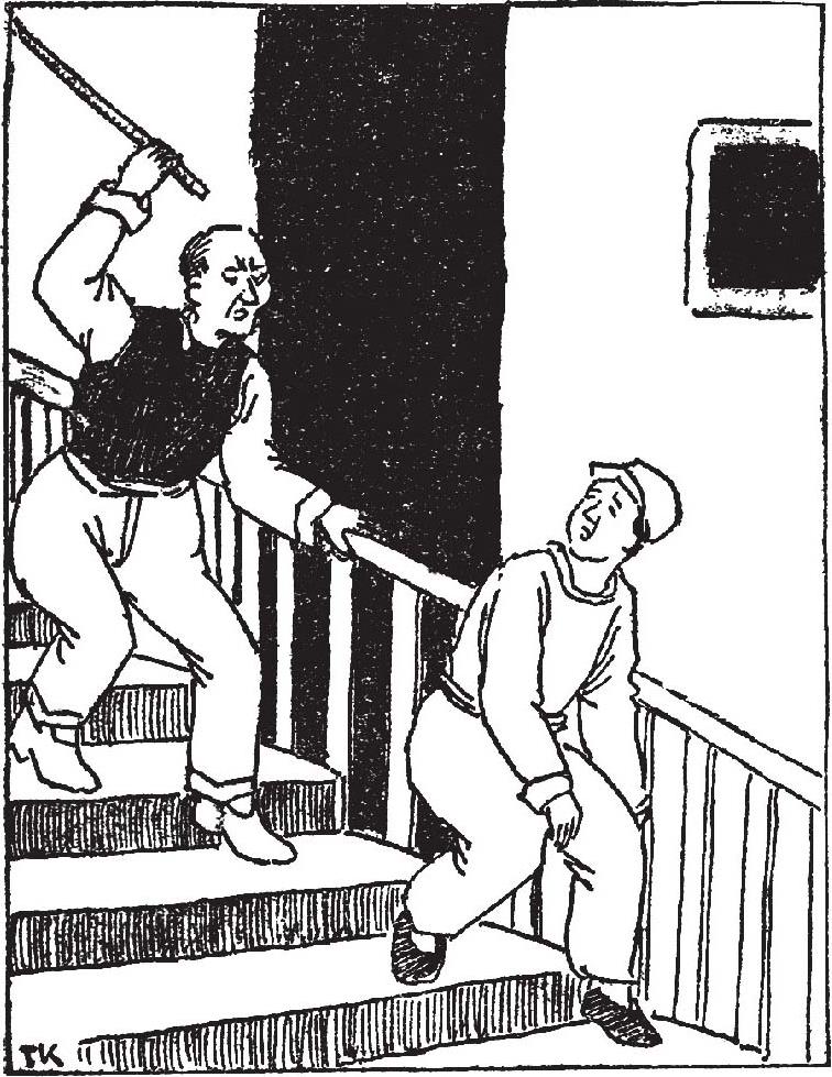 “哦,你这个骗子!”裁缝吼起来,“全都一样坏,一样不负责任!你们休想再拿我当傻瓜!”他气急败坏,跑回去抓起尺子朝可怜的小伙子背上一阵猛打,老三也只好逃离了家门。