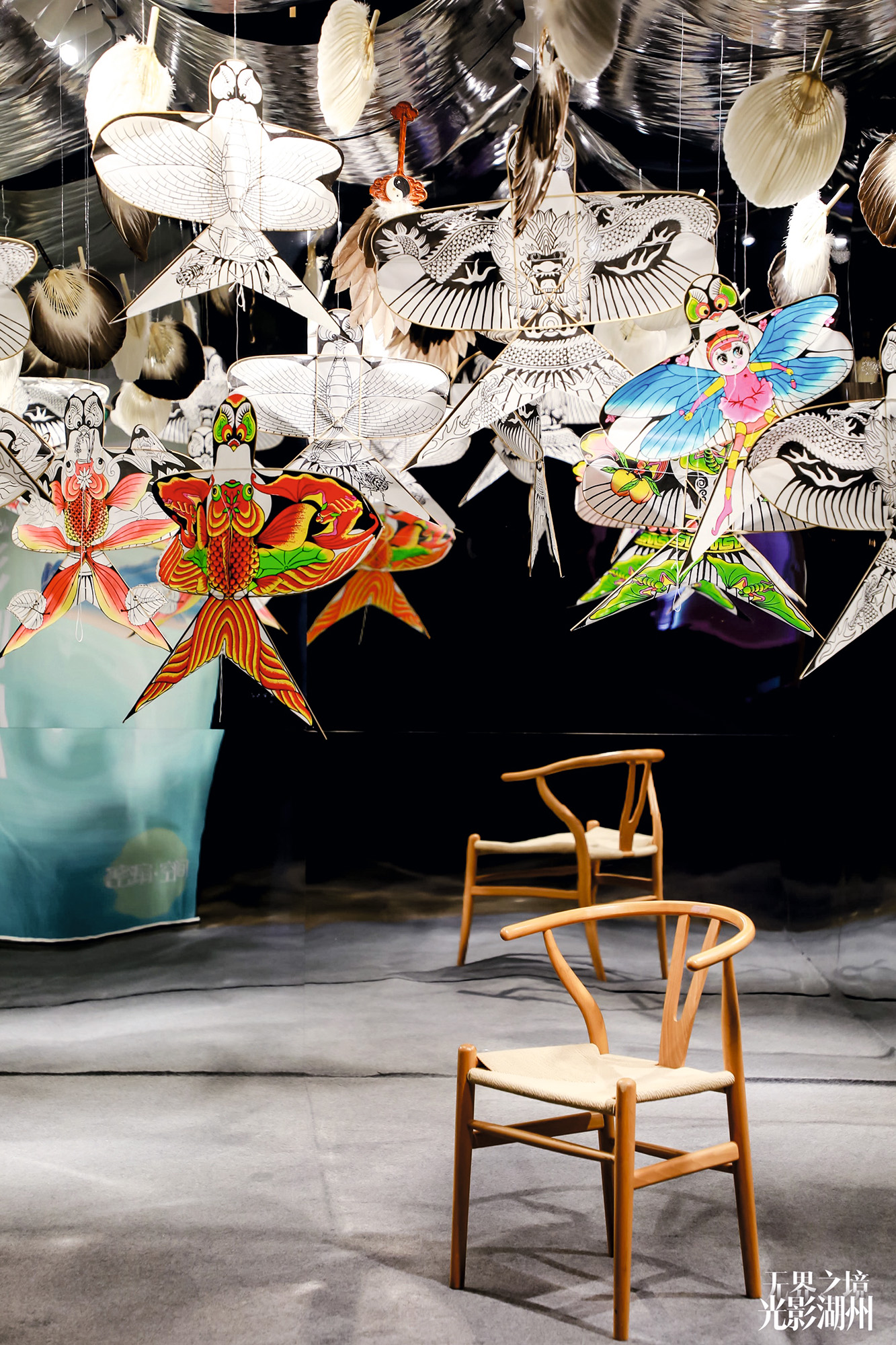 “无界之境·光影湖州”非遗美学展中的风筝装置,该展由非遗策展人李媛媛策展。