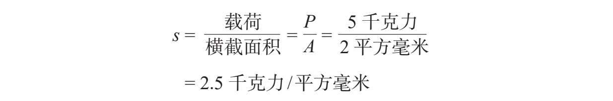回到我们上一章中提到的砖头例子。如果砖头重5千克,绳子的横截面积为2平方毫米,那么绳子的应力为: