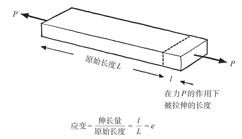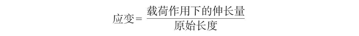 像应力一样,应变与材料的长度、横截面积或形状都无关,它只是某个点的状态。此外,因为我们计算应变时是用一个长度除以另一个长度——伸长量除以原长,所以应变是一个比值,它没有单位,无论是在国际单位制、英制还是其他任何单位制中。当然,上述种种既适用于拉伸的情况,也适用于压缩的情况。