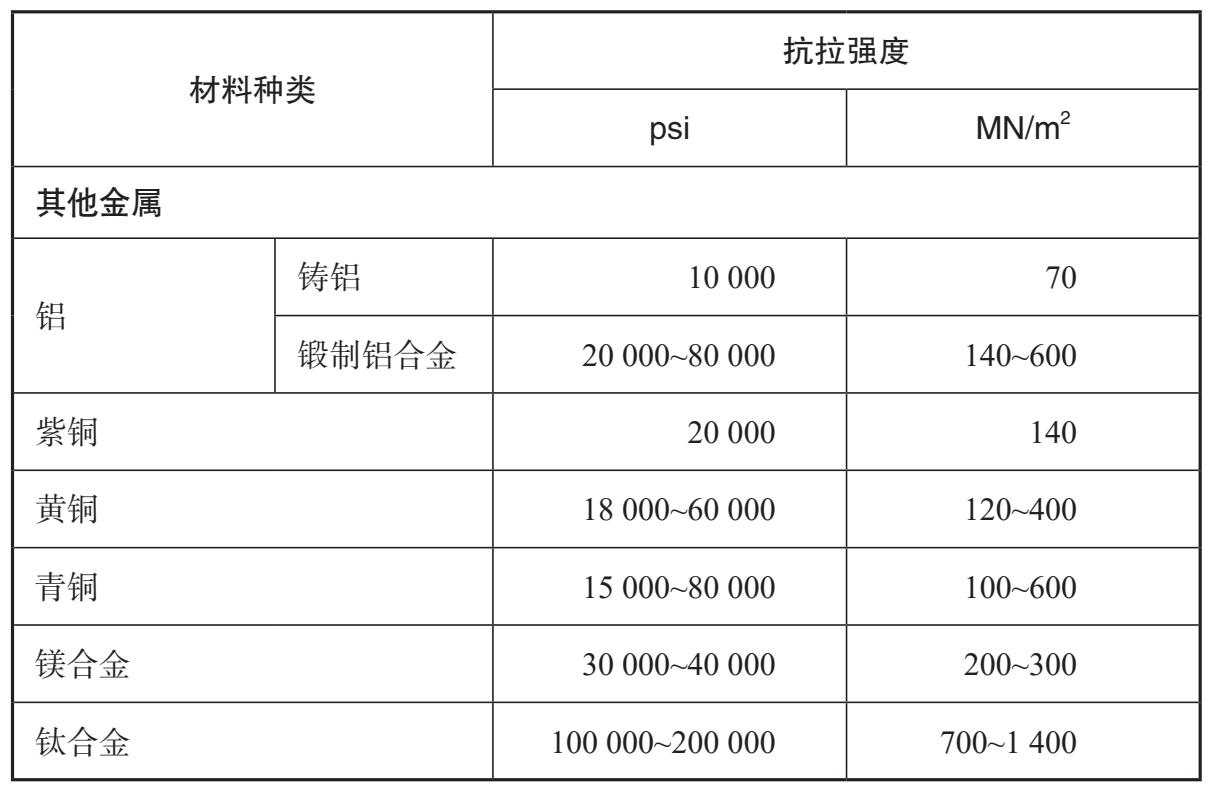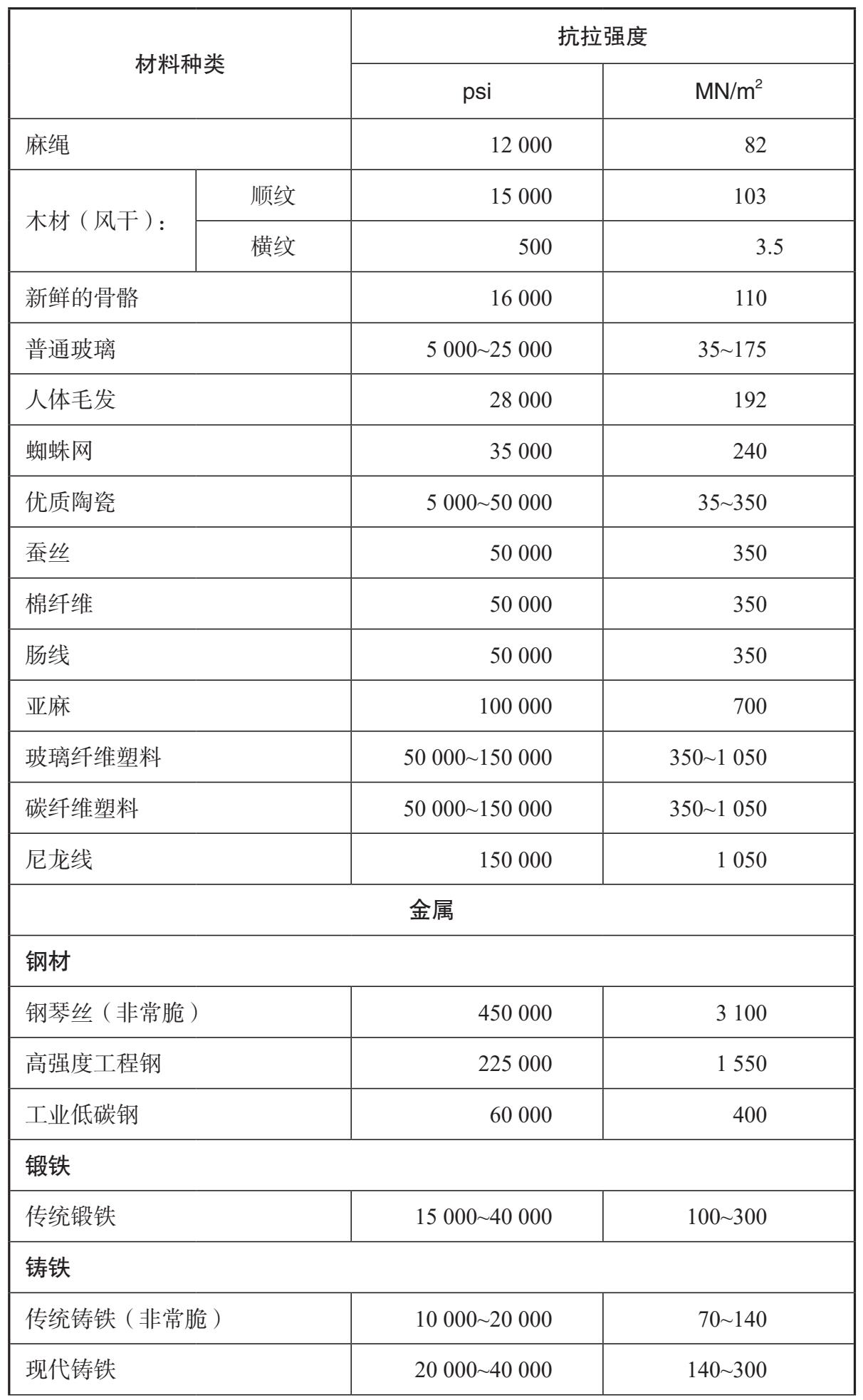 材料强度是指破坏材料本身所需的应力,以psi、MN/m 2 或kgf/cm 2 为单位。对于某种固体,无论其样品形态如何,其材料强度一般都是相同的。我们最常关注的是材料的抗拉强度,有时也叫作“极限拉应力”,通常使用测试仪器拉断小型试样来确定。所以,我们往往会根据已知的材料强度来测算结构强度。