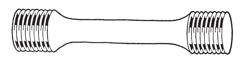 今天,当我们测试一种材料(与测试一个结构不同)时,我们一般会制取一份所谓的“试样”。试样的形状可能各不相同,但它们通常都有一个平直的主体(可在其上做测试),末端更粗一些(可用来与测试仪器连接)。普通的金属试样一般如图3–3所示。