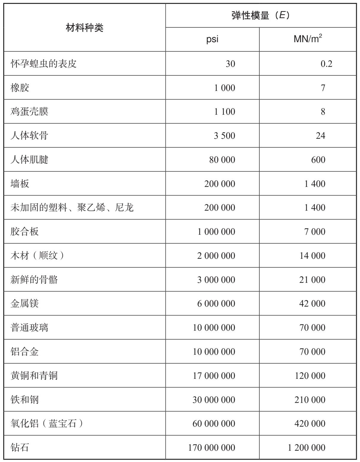 常见生物材料和工程材料的弹性模量值可见表3–1:从怀孕蝗虫的表皮(其值很低,但对生物材料而言,不算特别低;顺便说一下,雄性蝗虫和雌性蝗虫幼虫的表皮都很强劲)起,弹性模量按升序排列,直至钻石。我们将看到,在刚度变化区间内,上限与下限之比大到6 000 000。我们将在第8章中探讨其中的原因。