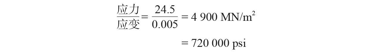 回想一下绳子的例子,它在由砖头的重量产生的24.5 MN/m 2 或3 600 psi应力的影响下,产生了0.5%或0.005的应变。所以,绳子的弹性模量为: