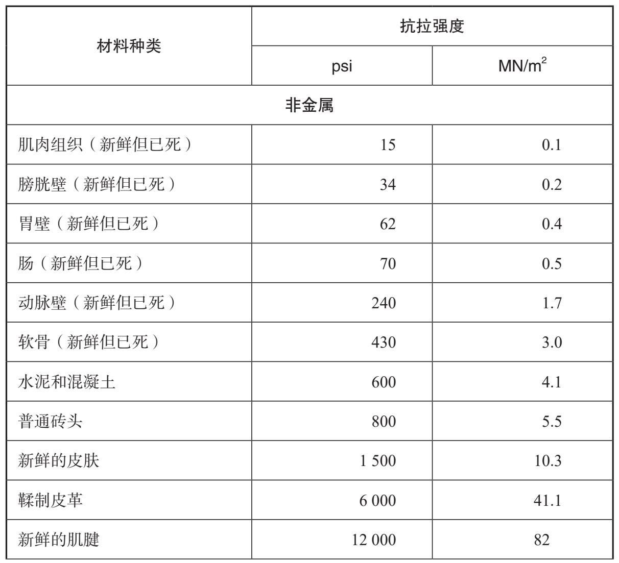 表3–2给出了很多材料的抗拉强度。与刚度一样,生物意义和工程意义上的固体,其强度的变化范围很广。例如,肌肉之弱和肌腱之强对比显著,这也可以解释为何肌肉及其等效肌腱的截面不同。当我们小腿肚上粗壮且时而凸起的肌肉将其紧张状态传递给脚后跟的骨头时,我们便能行走和跳跃,靠的就是跟腱,它尽管非常纤细,但足以胜任这项功能。此外,我们也将看到,为什么工程师向未被强钢筋加固的混凝土贸然施加拉力,是一种不明智之举。