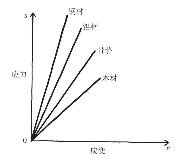 图3–5 应力–应变曲线的直线部分的斜率表征了不同材料的不同弹性。斜率 E 表示的是弹性模量