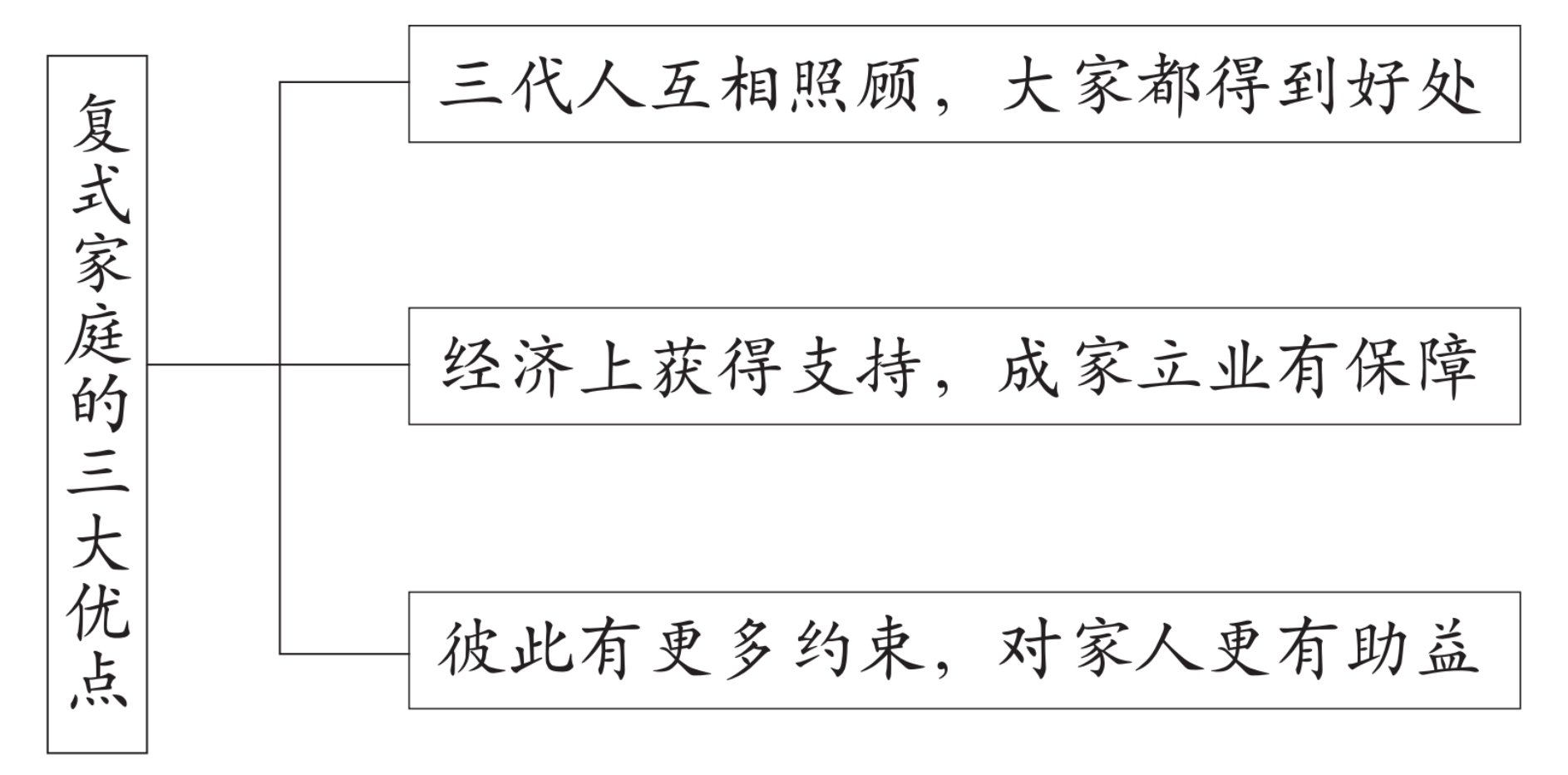 西方人如果看得懂中国人的复式家庭所具有的浓厚亲情以及彼此互相依赖的好处,大致都会对三代同堂产生良好的观感,甚至羡慕地说:“做中国人真好!”因为这种复式家庭,至少具有以下三大优点(如图1-5所示):