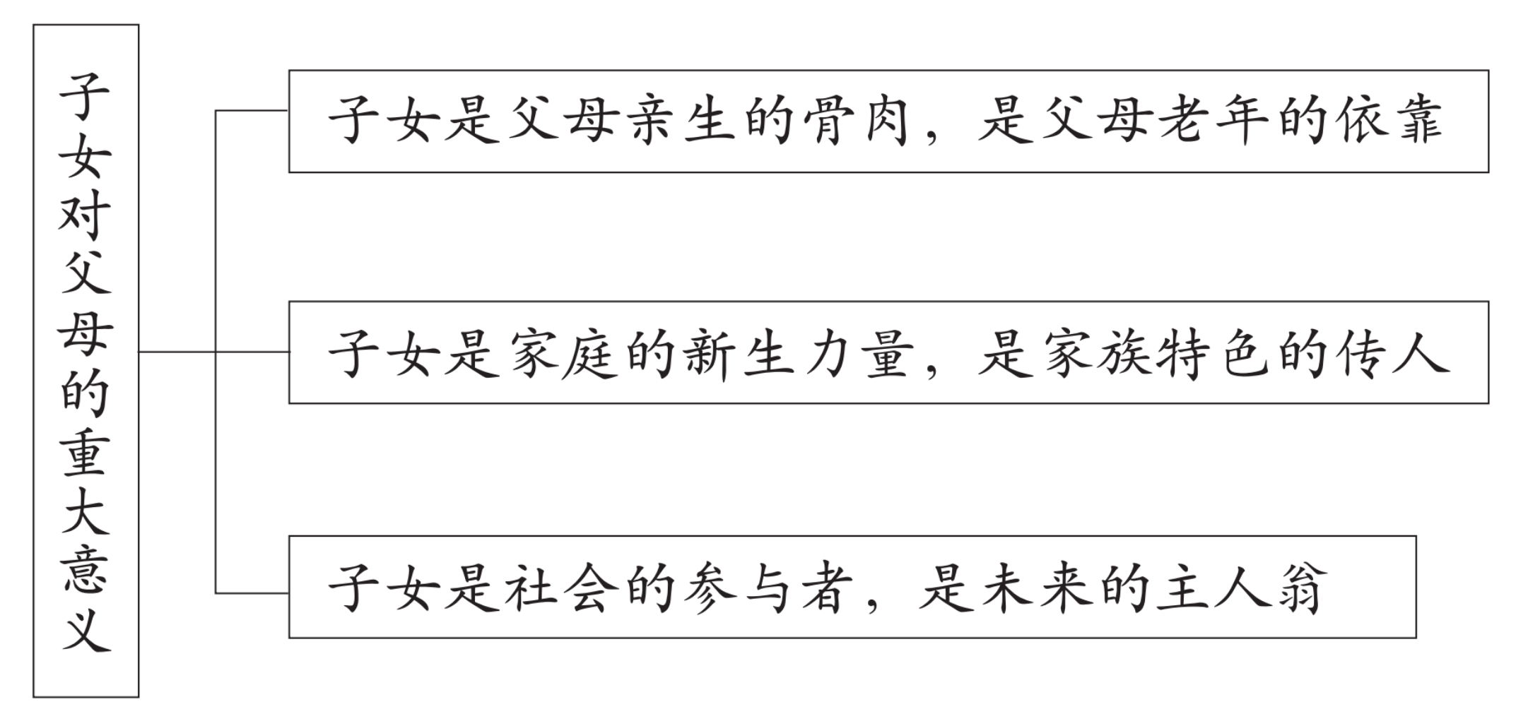 天地、祖先和父母有一个共同的愿望,那就是我们常说的“早生贵子”。这里的“子”,当然包含女儿在内。因为若是重视儿子,不重视女儿,岂非失去平衡?天地之间,必须有男有女,才能够生生不息。生男育女,应该是一样好才对。天地需要人来治理、改善,祖先需要后代子孙来光大家族的品德和事业,而父母也需要子女生育孙辈才能够享受晚年含饴弄孙的乐趣。总的来说,子女对父母有以下三个重大意义(如图1-2所示):