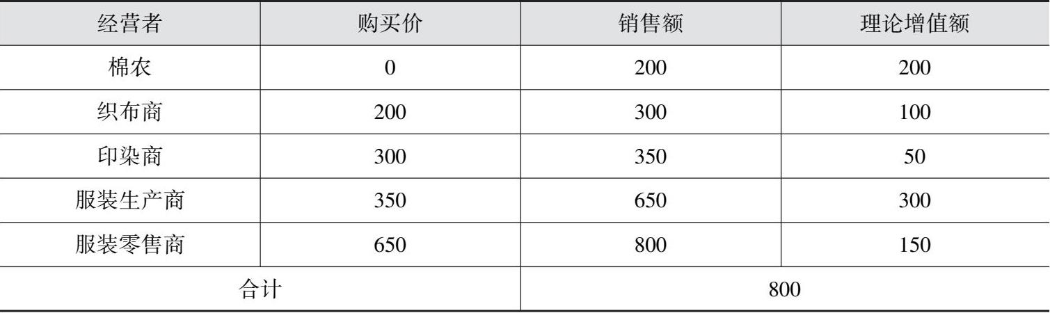 以服装的生产流通全过程为例,假定在第一个环节棉农完全自己生产棉花,其购进额为零(不考虑肥料、种子等价值),最后一个环节服装的零售价格为 800 元,这 800 元是由五个流转环节共同创造的。服装生产流通每一环节的购买价、销售额和理论增值额如表2-1 所示。