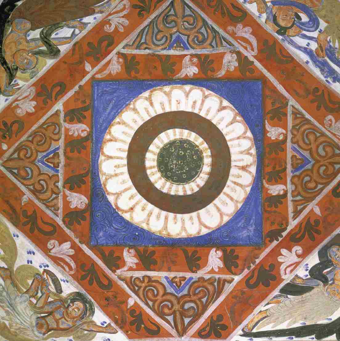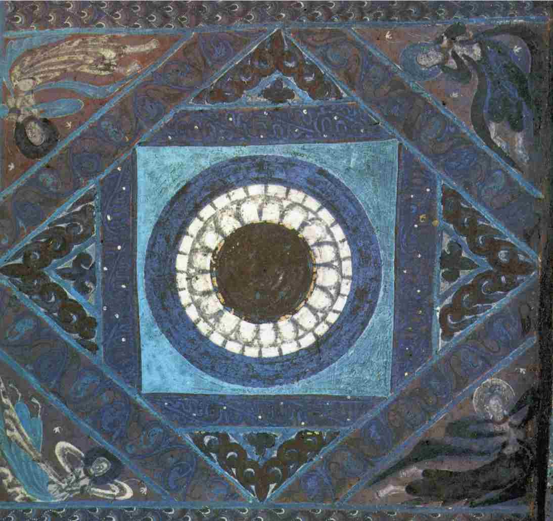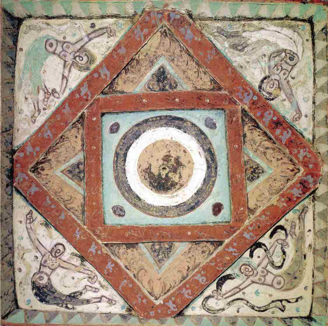 第二八五窟窟顶图案的“四角绘摩尼宝火焰纹”,是莫高窟早期石窟藻井式或平棊式图案的流行做法:仿斗四藻井的内里两个方井相叠,形成四个三角形空间,——后世称此为“角蝉”