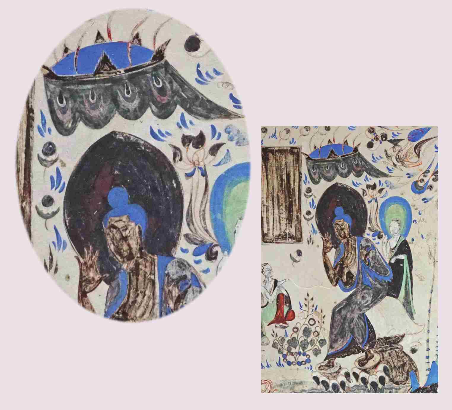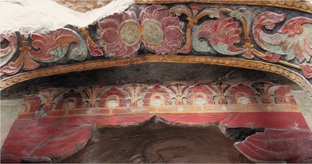 石窟覆斗式窟顶的设计构思既有来自对幄帐的模仿,则此三角形图案也应与帷帐密切相关。它的来源便是帐顶上面的博山,不过博山在此乃与摩尼宝纹样的表现因素相结合而演变为藻井的适合图案。