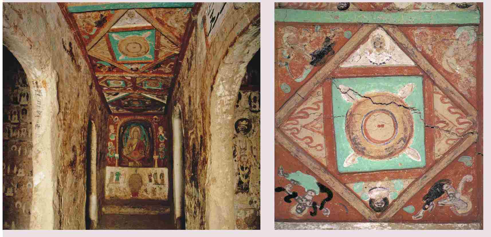 〔9〕。之后的北魏第二五四窟、北周第四二八窟中心柱外的一周平棊,均为类似图案,但是不再结合泥塑,而全部出以绘笔