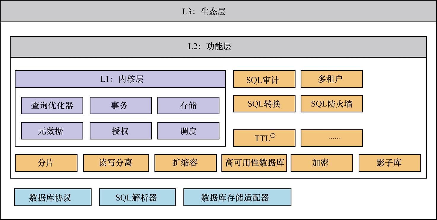 ShardingSphere的可插拔架构由微内核和3层可插拔模块组成。ShardingSphere架构之上是顶层API,因此内核根本不知道各种功能的存在。对于不需要的功能,只需将相关的依赖删除即可,而这不会给系统带来任何影响。图1.3展示了ShardingSphere的内部结构。