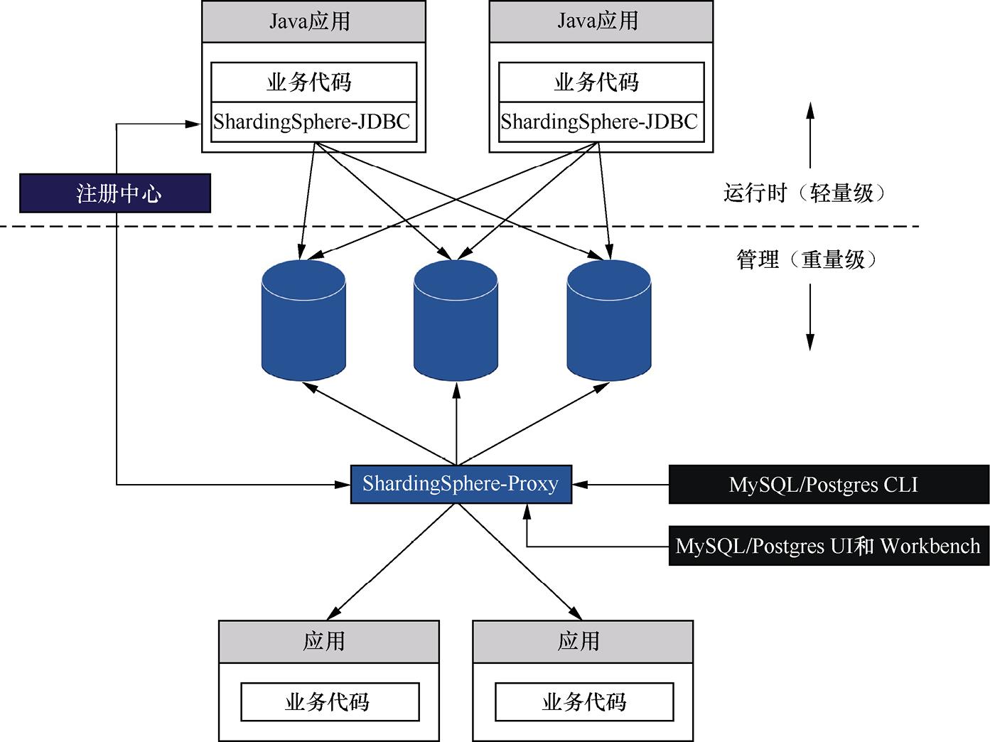 ShardingSphere-JDBC采用非集中式架构,适用于基于Java的轻量级、高性能OLTP应用,而ShardingSphere-Proxy提供了静态入口和异构语言支持,适用于联机分析处理(online analytical processing,OLAP)应用,还适用于管理和操作分片数据库。