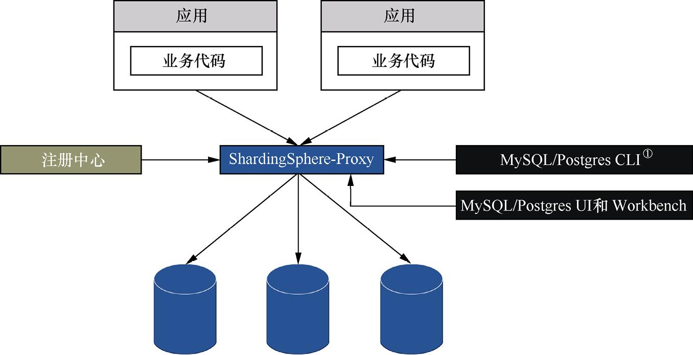 图1.4是ShardingSphere-Proxy的典型系统的拓扑结构,展示了ShardingSphere-Proxy所处的位置。