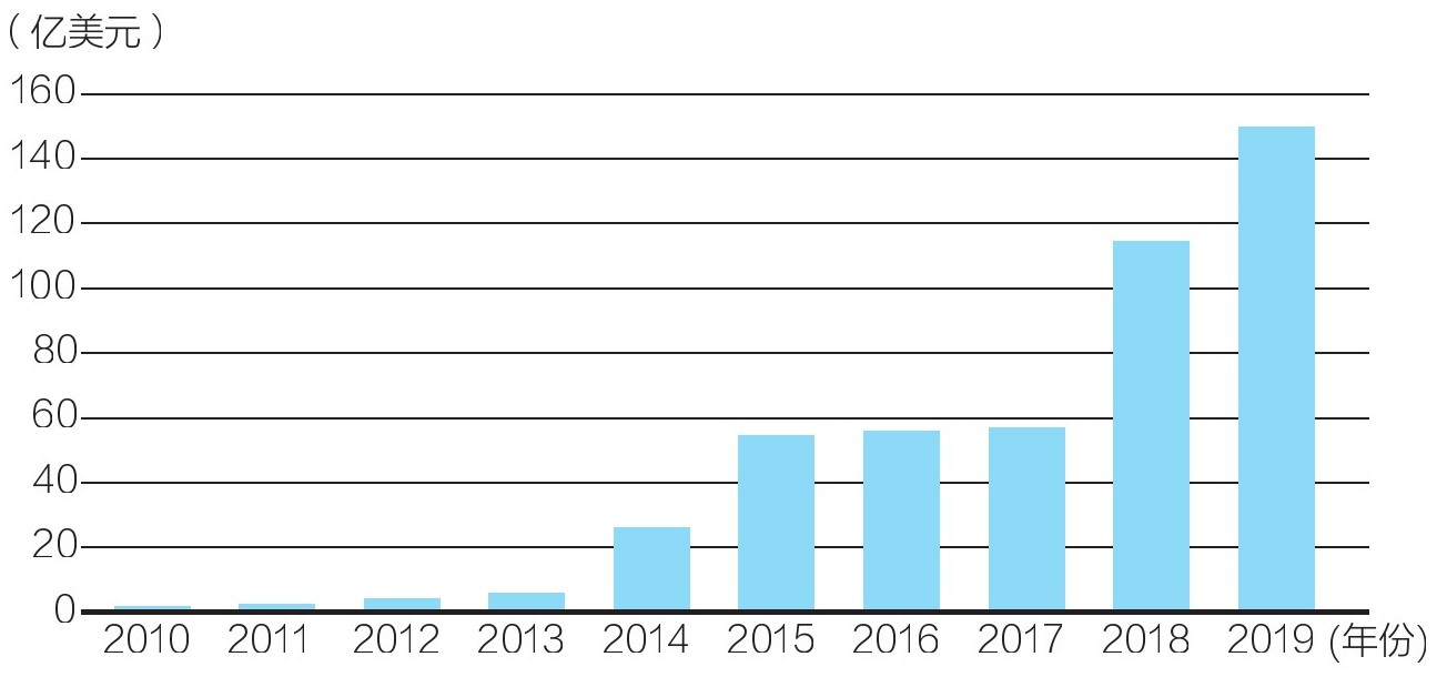 在日本,食品科技对于人们来说还比较陌生。但是在欧美国家,食品科技早已不是什么新鲜事物。根据美国Pitchbook调查,如图1-1所示,从2014年开始美国风险资本对食品科技领域的投资迅速增加。2019年的投资额达到150亿美元,大致相当于2014年投资额的5倍。
