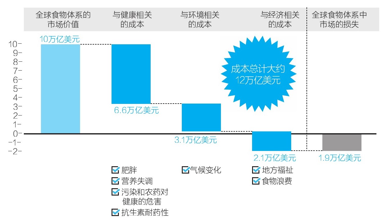 2019年秋天,在美国举办的一场小型会议上展示了一组令人震惊的数字。如图1-4所示,据估算全球食物体系每年创造的市场价值达到10万亿美元。而与食物体系相关的健康、环境、经济的成本约高达12万亿美元,远远超过了其创造的附加值。也就是说,我们吃得越多对身心造成的伤害越大,与会者无不对此深表忧虑。