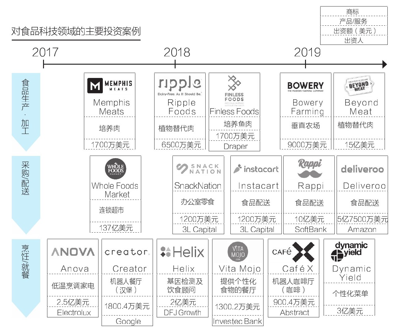 如图1-2所示,投资最活跃的几个领域包括以植物替代肉为代表的新食材、送餐服务、机器人餐厅、个性化食物等。美国亚马逊大手笔收购全食超市,成为当年人们热议的话题。另外,在新食材领域,作为替代蛋白的植物替代肉和培养肉也受到人们的广泛关注(具体内容将在本书第4章中介绍)。微软的创始人比尔·盖茨也积极地对替代蛋白领域进行投资,例如培养肉初创企业。在欧洲,家电生产厂商伊莱克斯收购了美国低温烹调家电初创企业Anova,美国的谷歌对生产汉堡的机器人公司Creator进行投资,大企业对初创企业的投资越来越活跃。在美国,涉足食品科技的风险投资据说超过了200家。投资最踊跃的领域当属替代蛋白,甚至出现了只针对该领域进行投资的企业。