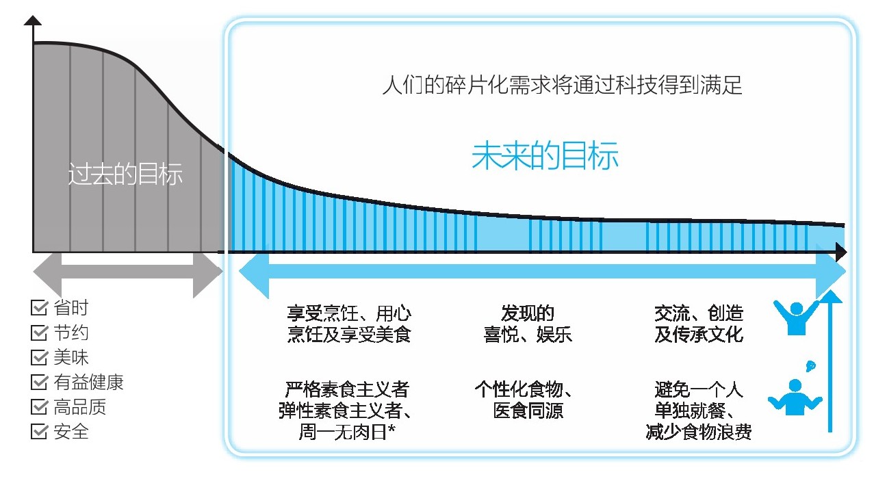 也许看了下面的例子你就会明白,为了应付忙碌的生活,我们往往希望饭菜更省时更便宜。但是你会发现实际上我们很多时候并不是真的仅仅满足于省时和便宜。我们正越来越强烈地追求原本存在于我们内心深处的潜在需要,例如“想要更加享受烹饪的过程”、“想要在烹饪上花费更多的时间”、“想要更精致地生活”、“想要品尝更适合自己身体的食物”、“想要在就餐的过程中更好地和家人进行交流”、“想要通过食物让自己变得不再孤独”,以及“想要减少食物浪费”等等。