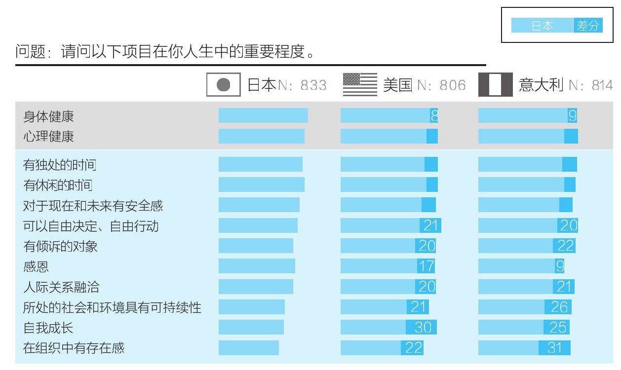 调查结果如图1-8所示(实际调查时的分类更细致,包括12个项目)。首先三个国家的人都认为身心健康很重要。其次人们对某些项目的重视程度要更高一些,例如日本人更重视“有独处的时间”“有休闲的时间”。在美国和意大利,人们认为“可以自由决定、自由行动”和“身心健康”同等重要。另外,美国人对“自我成长”,意大利人对“所处的社会和环境具有可持续性”的重视程度要高于其他国家。如果将以上项目看作衡量幸福的指标,并将这些项目替换成食物的价值我们就会有一些新的发现。