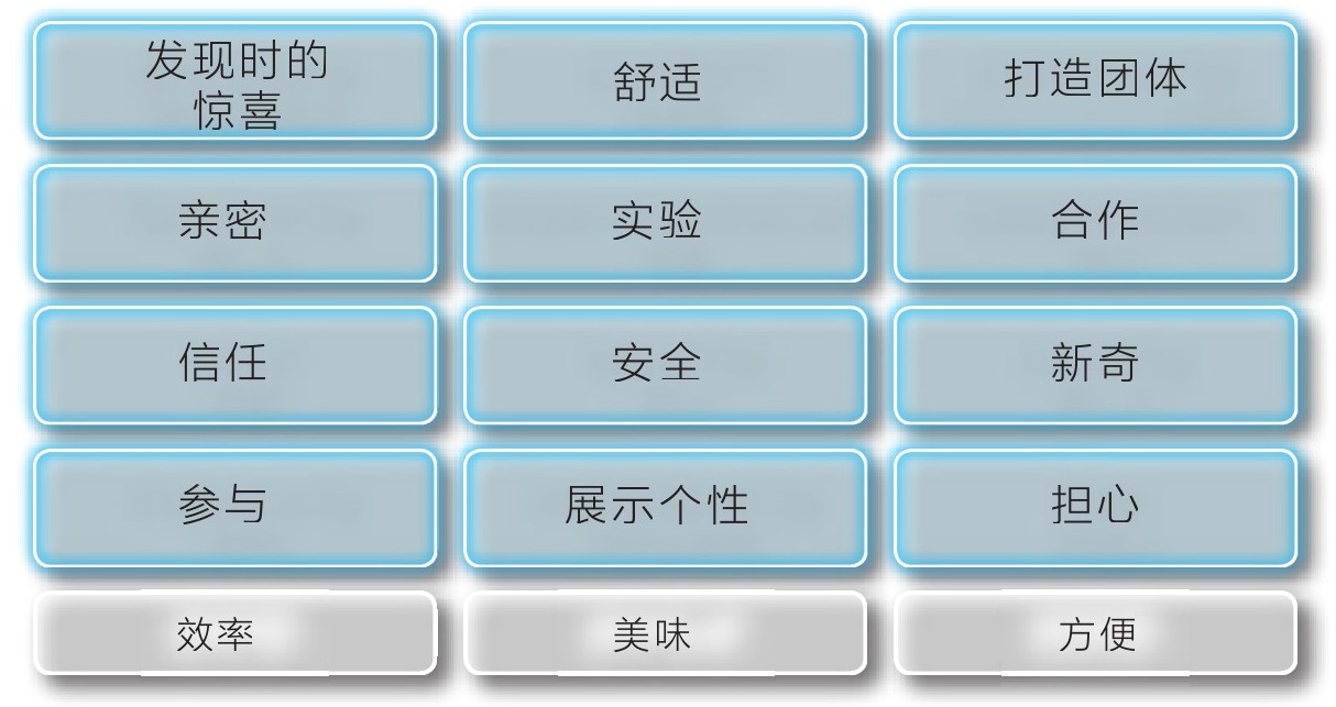 Institute for the Future是一家美国智库,过去50多年一直从事未来研究,在2017年举办的美国智能厨房峰会上,该机构的丽贝卡·切斯尼(Rebecca Chesney)在原有的“效率”“美味”“方便”这些概念基础之上,将现代社会中食物的价值进一步分解为“发现时的惊喜”“打造团体”“展示个性”“信任”“合作”等12个项目,重新定义了食物的价值。同时她指出未来的食品科技应该以实现这些价值为目标(图1-5)。