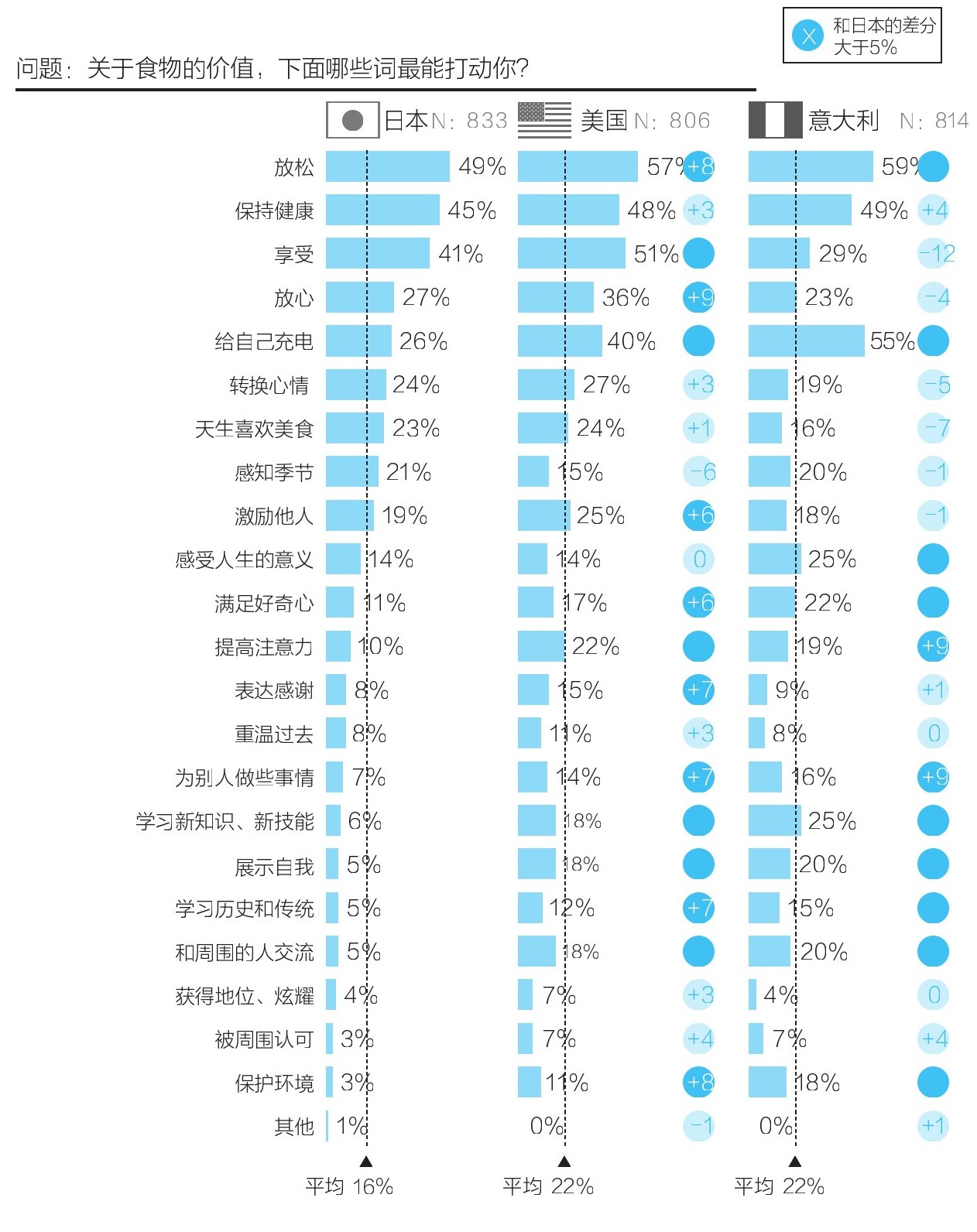 让人意想不到的是,与日本相比,在美国和意大利,食物价值的多样化特征更加显著。在日本只有不到10%的人认同的项目,在美国和意大利居然得到了20%左右的人的支持。其中支持率较高的几个项目分别是“学习新知识、新技能”“展示自我”“和周围的人交流”。虽然这几个项目的排名比较靠后,但如果想到美国和意大利总人口的20%都有这样的想法,这些项目还是值得我们关注的。