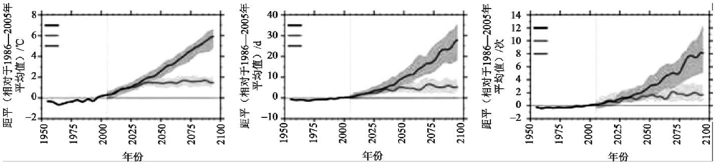 注:左图显示了中国年均最高气温,中图显示了最高气温>35摄氏度的年均天数,右图显示了出现连续5天以上35摄氏度的年均热浪次数,黑线代表1986~2005年观测到的异常现象平均值。