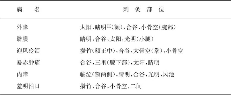 7.针灸 乃是用针或烧艾团以治病。中国古时极盛行。兹按眼病名及针灸部位列表如下(表1-12):