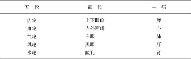 中国医学对于眼之解剖极为粗略,仅知有白眼(白睛)、黑眼(黑睛)、瞳人(瞳神)、上下胞、大眦、小眦、脾(睑)、神膏、神水、神光等。后来更按部位分为五轮八廓,五轮(表1-1)本于五行,便是将眼球区分为五圆圈,八廓(表1-2)本于八卦,便是将眼球划外为八部分,从解剖观点轮