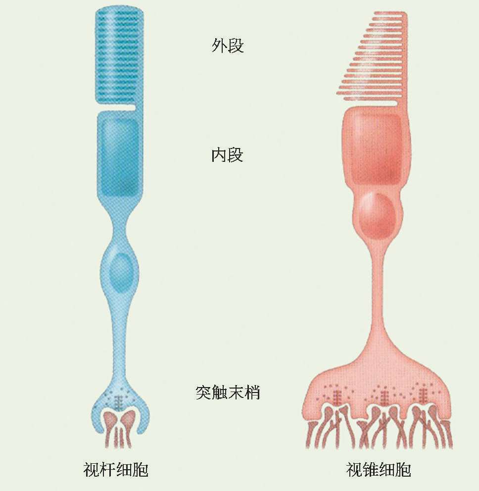 在人的视网膜中,视杆细胞的数目大约有 9 000 万个,而视锥细胞大概只有四五百万个。在视杆细胞中只有一种视色素,它对光非常敏感,即使在非常昏暗的条件下也能工作,不过它不能区分颜色,空间分辨率也低。正常人视锥细胞中的视色素可以分成三种,分别对三种不同波长的光最敏感,所以它们可区分颜色,而且空间分辨率也高,但是它们只有在光照明亮时才能工作。在视网膜中心有一块微微凹陷下去的区域,称为中央凹。在中央凹的中心完全没有视杆细胞,都是视锥细胞,因此中央凹在昏暗的条件下实际上是瞎的。这就是为什么看黯淡的星星时,如果把目光对准星星所在的位置反而看不见的道理,因为这时星光正落在中央凹处。偏离中央凹,视杆细胞渐渐增多,到大约离中央凹中心 20°处达到峰值,然后又渐渐减少。所以,如果把目光偏离 20°左右,让星光所落之处正是视网膜上视杆细胞密度最高的地方,就能看见黯淡的星星。但是在大白天,如果要看清某个对象的细节和颜色,就要把目光对准这个对象,使它的像落在中央凹的视锥上。绝大多数的视锥细胞都集中在中央凹处。