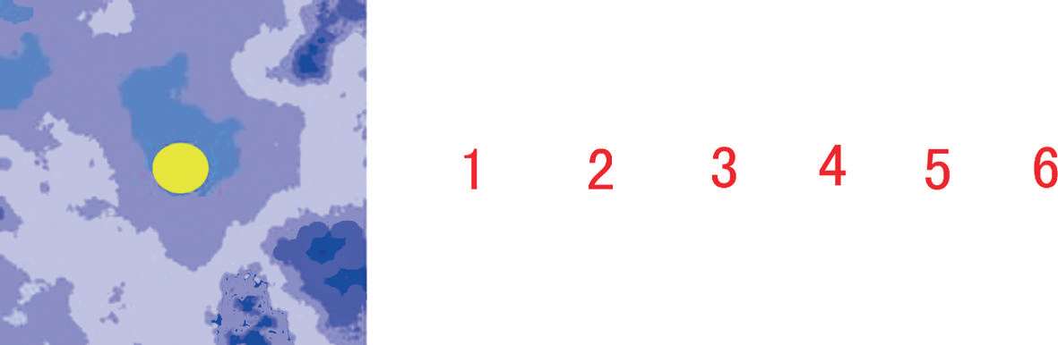 我们都知道,视网膜中感光细胞在最深层,其他的神经细胞、血管和视神经倒是在其前面,所有这些视神经和血管都要集中成一束,重新从视网膜上“盲点”处(图 2.1 中所示的视盘处)穿过视网膜离开眼睛,所以在盲点处就没地方安置光感受器了,当然也就不能对外界刺激起反应,但我们从来也没有觉得我们所看到的景物在盲点处有个洞!如果从光感受器所接收到的光的模式来说,“应该”存在着这样的一个洞,不过大脑把这个洞用它四周的颜色和纹理填补了起来,以致我们觉察不出来。如果眼睛真的完全像一台照相机的话,那么底片在相应于视网膜盲点处就会有一块黑斑。闭上右眼,只用左眼注视图 2.6中的某个数字,例如 4,随后慢慢使你的身体前倾或后仰以调节眼睛到这张图的距离,当位置合适的时候,左边方块图中央的黄色圆斑正好落到盲点上,这时你就看不到这个黄色圆斑,看到的是深度不均匀的一片暗色(究竟是什么颜色不是很分明,你知道这是为什么吗?)。这就证明我们的大脑确实有某种补插的功能!但这种补插功能的内在机制是什么,现在还不清楚。